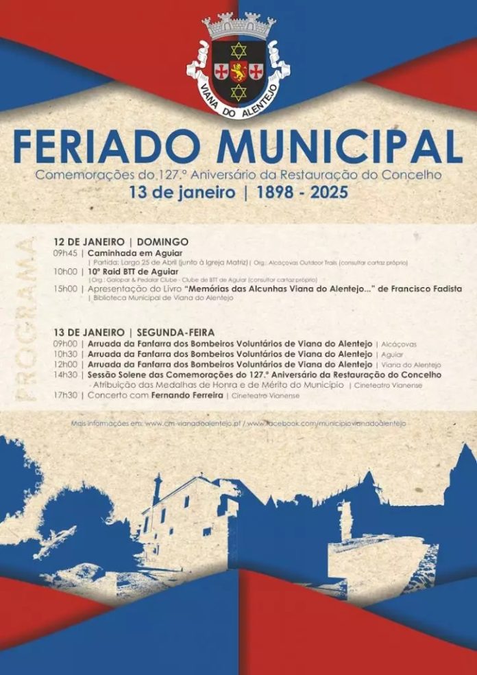 O Município de Viana do Alentejo assinala no próximo dia 13 de janeiro, o 127º aniversário da Restauração do Concelho, numa cerimónia que terá lugar no Cineteatro Vianense, pelas 14h30.